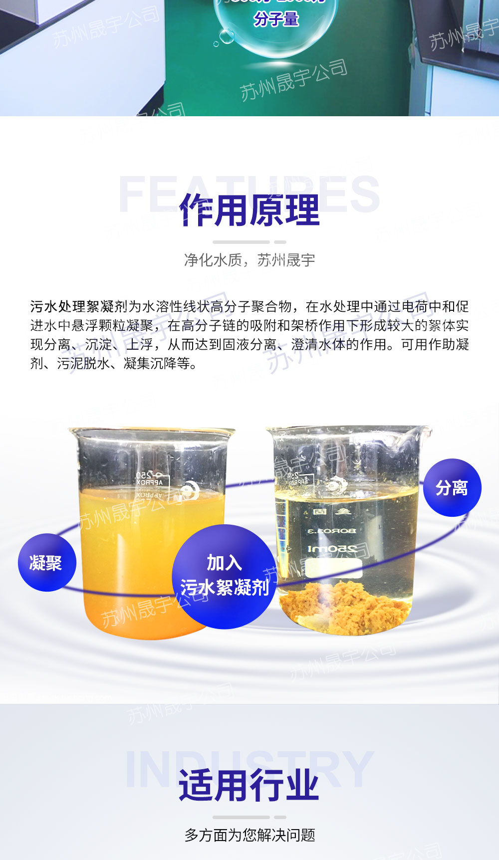 污水絮凝剂产品形态:白色颗粒粉状、乳液,使用范围:污水处理,分子量:600-2000,离子型:阴离子、阳离子、非离子,包装规格:25公斤,使用浓度:通常0.05%-0.20%,储存条件:阴凉干燥库房内。污水絮凝剂在水处理中通过电荷中和促进水中悬浮颗粒凝聚,在高分子链的吸附和架桥作用下形成较大的絮体实现分离、沉淀、上浮。